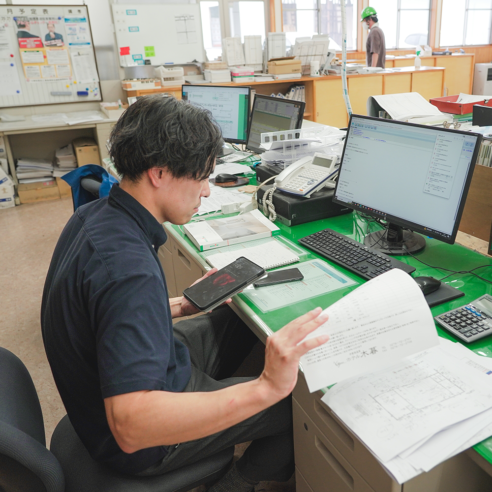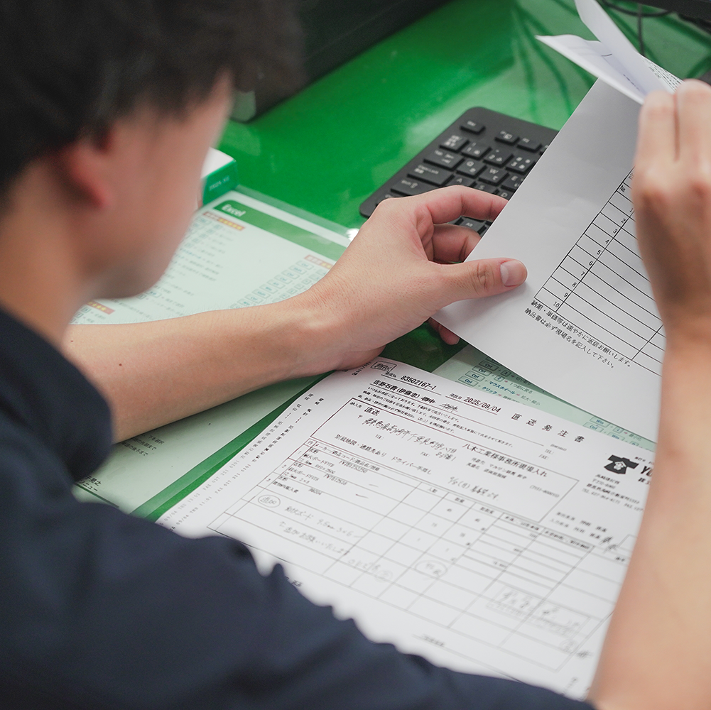 電話対応も多く、仕入れ先や現場と連携しながらテンポよく処理していきます。